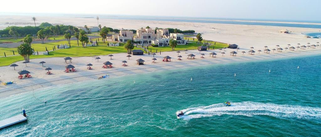 The journey begins with the crossing: Abu Dhabi’s skyline slowly fades, replaced by golden reflections of the sun on the water. Upon arrival, tall palms, fine sand and crystalline sea set the tone — that of discreet luxury where nature reigns supreme.