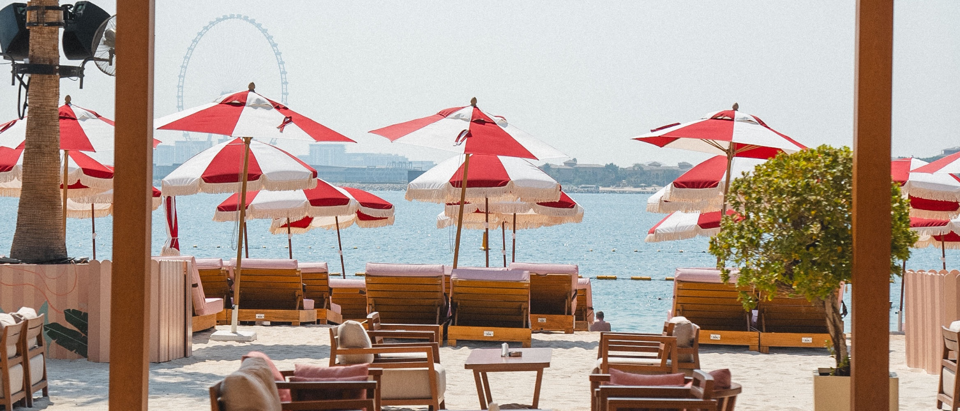 Under Dubai’s dazzling sun, the venue unveils its seaside scenography: linen-colored parasols, light-wood furniture, ochre and sand tones, reflections of turquoise waters as far as the eye can see. The décor evokes the Mediterranean while capturing the cosmopolitan energy of the Gulf.