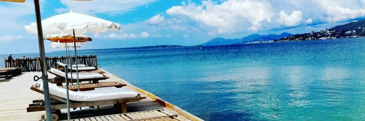 La Plage des Îles, située au cœur de Juan-les-Pins, est un véritable havre de paix qui combine élégance et simplicité. Avec son ponton en bois qui s'avance sur l'eau cristalline, cette plage offre un cadre exceptionnel pour se détendre. La décoration sobre, dominée par le bois et le blanc, crée une atmosphère apaisante et chic, renforcée par les matelas et parasols blancs qui s'intègrent parfaitement dans ce décor raffiné.