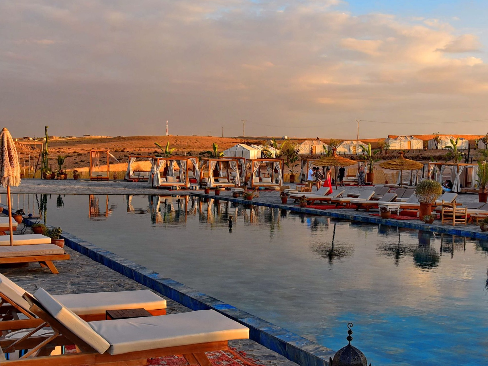 A circa quaranta minuti da Marrakech, La Bohème Agafay si apre sul deserto come un palcoscenico di luce. Le colline dorate scorrono all’orizzonte, la brezza muove le tele d’ombra e la piscina — discretamente riscaldata — diventa un’oasi fresca in mezzo alla quiete minerale dell’Agafay.